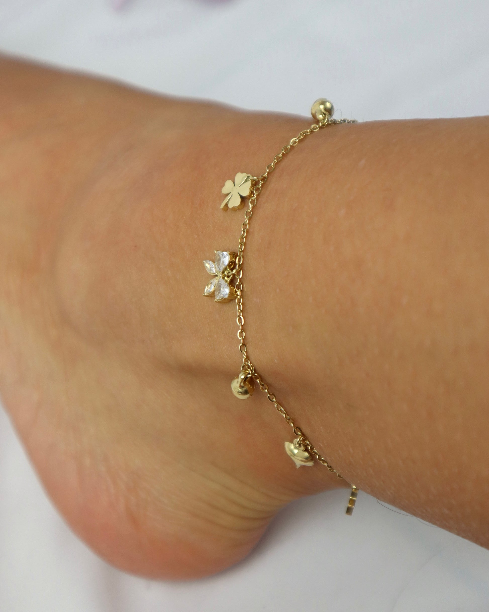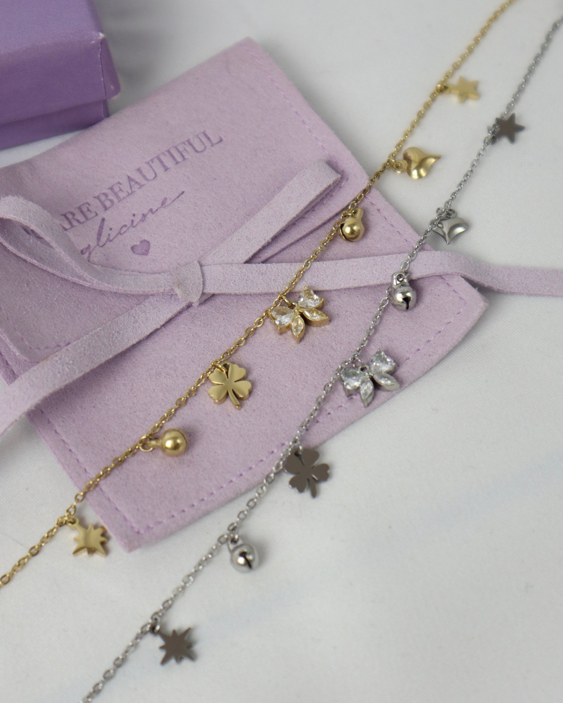 Cavigliera Lucky con sonaglio in acciaio inossidabile gold o silver, regolabile, con sonagli e charm.
