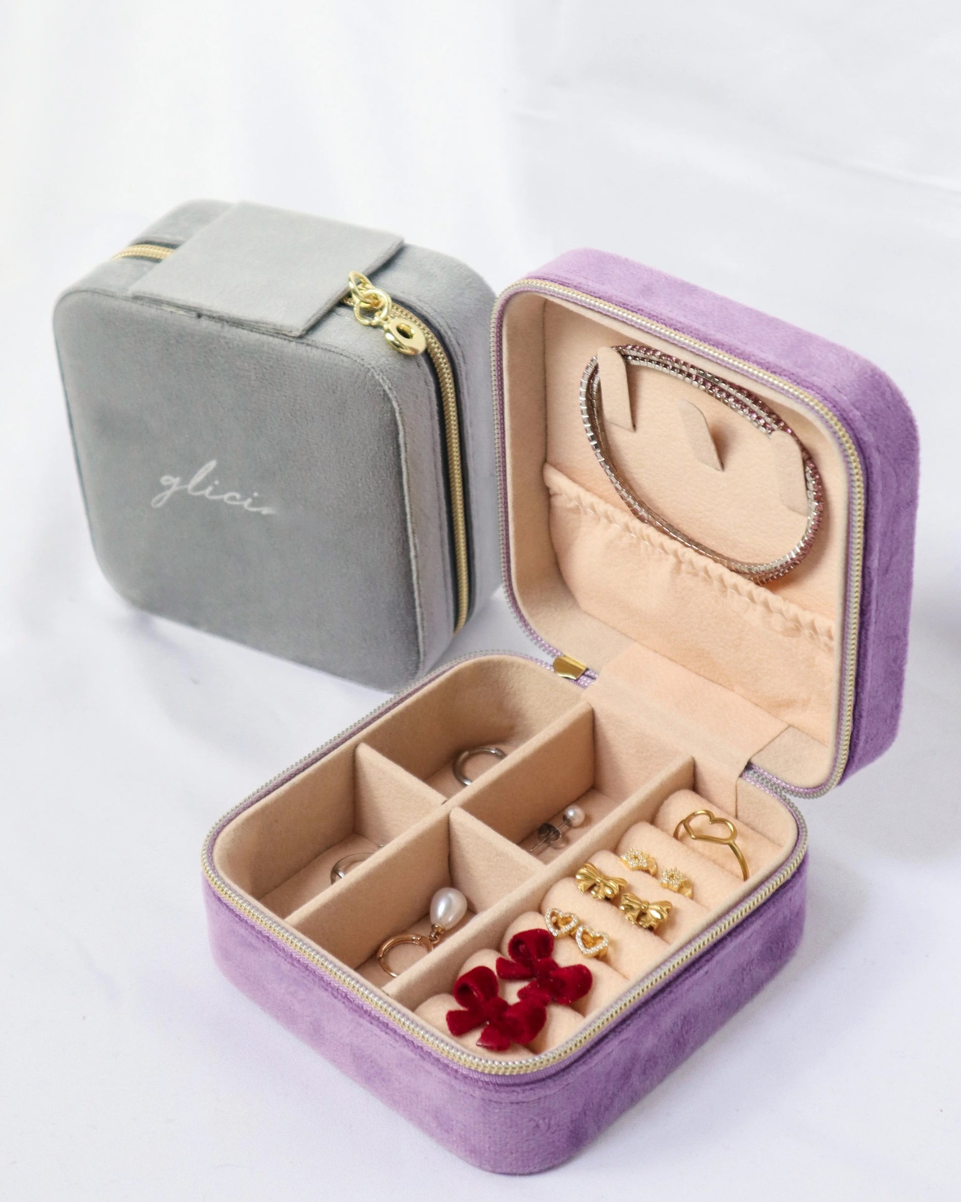 Cutie è il nuovo portagioie di Glicine che ti aiuterà ad organizzare i tuoi gioielli al meglio in casa e non solo! Comodo e pratico: portalo nei tuoi viaggi e piccole trasferte. Piccolo ma capiente, materiale velluto super resistente, logo Glicine e dettagli gold.