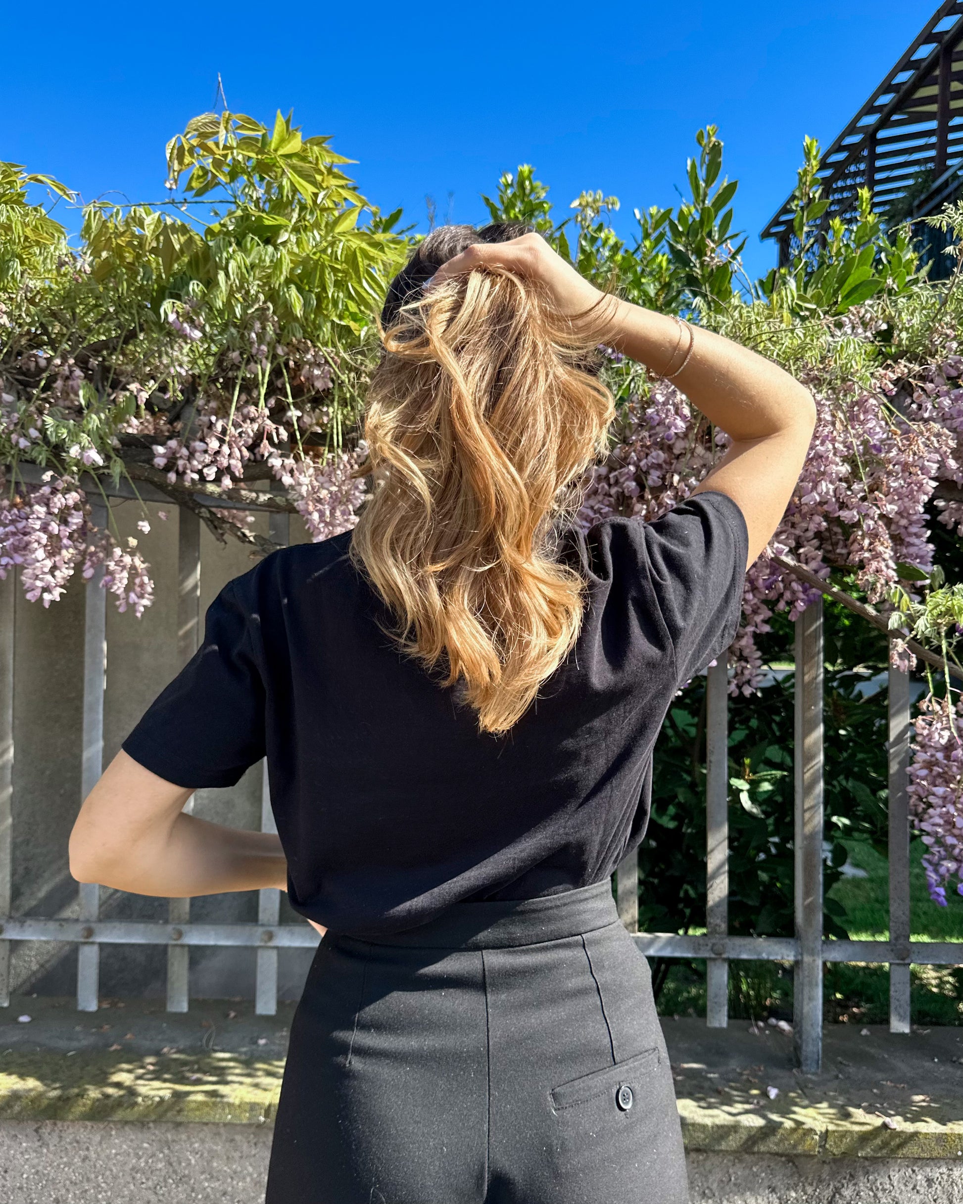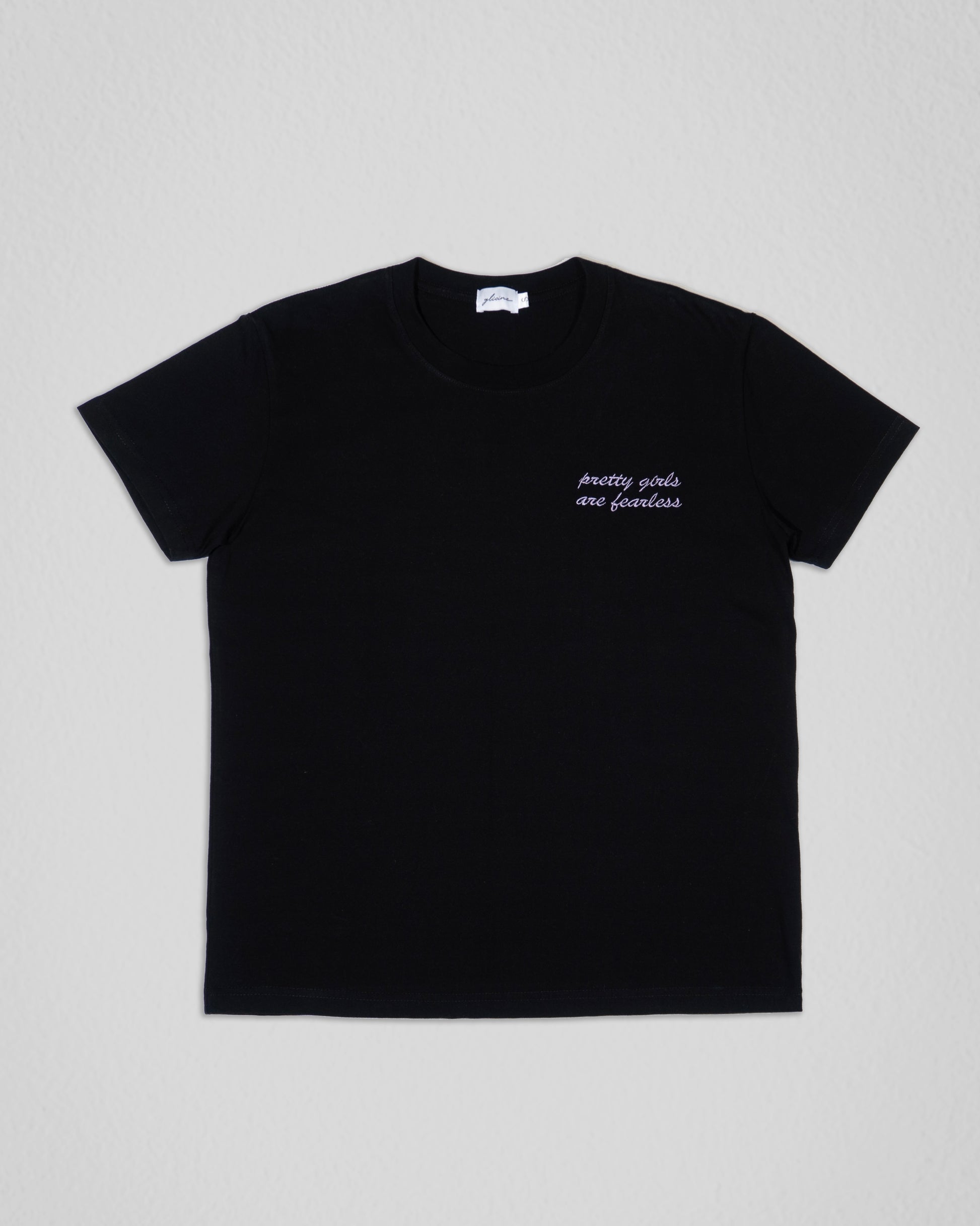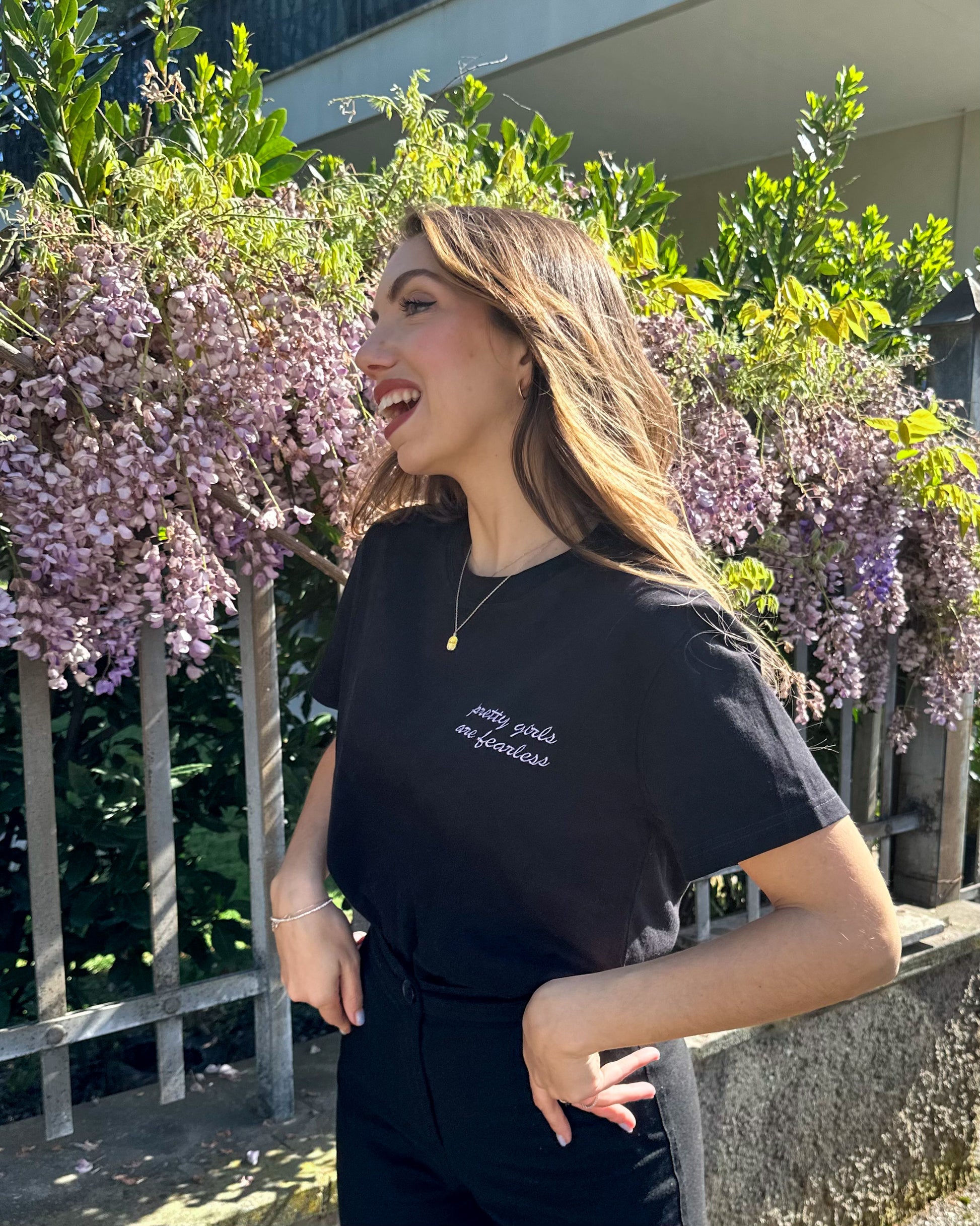 T-shirt nera in 100% cotone con ricamo handmade "pretty girls are fearless" lato cuore, fit morbido e oversize.